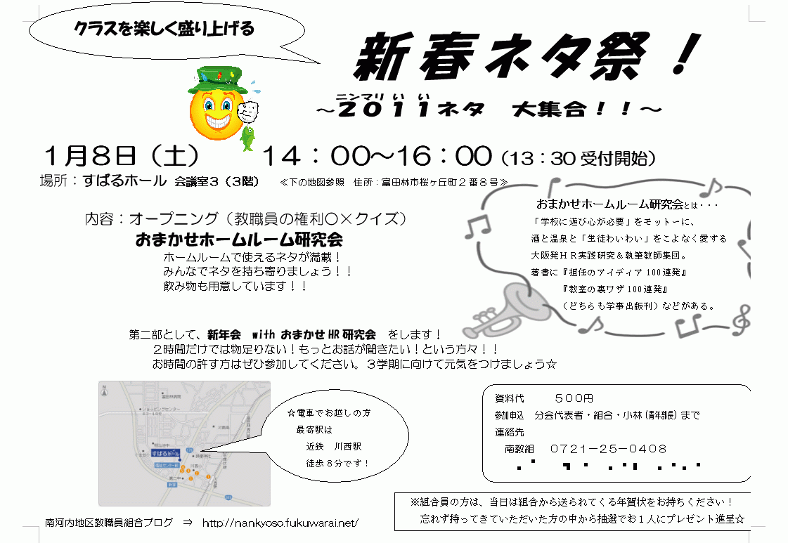 企画が終わった後、川西or富田林駅周辺での二次会を予定しています。おまかせホームルーム研究会の方も参加されますので時間に余裕のある方はぜひ!